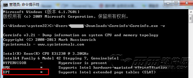 并在命令提示符中輸入 “Coreinfo安裝路徑/Coreinfo.exe -v”。intel的處理器,顯示為EPT(Extended Page Tables)。AMD處理器,顯示為NPT(Nested Page Tables)或RVI(Rapid Virtualization Indexing)。如果CPU支持SLAT,那么你會看見“EPT *”的字樣,否則看到的是“EPT -”。