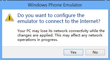 保存后,重新打開虛擬機。這次運行項目時,會提示“Do you want to configure the emulator to connect to the Internet?”,意思就是網絡連接丟失,我們選擇“Yes”,讓模擬器配置網絡連接。