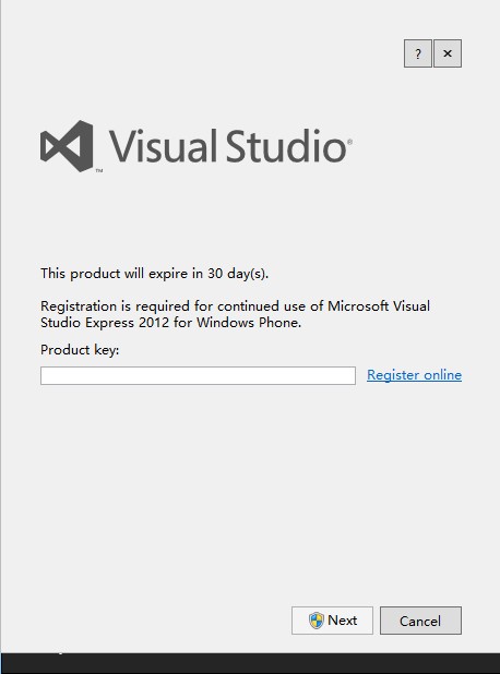 在運行Visual Studio Express 2012 For Windows Phone的時候,會要求輸入序列號,這個只需要點擊旁邊的“在線注冊”字樣注冊就可以收到帶有序列號的郵件。