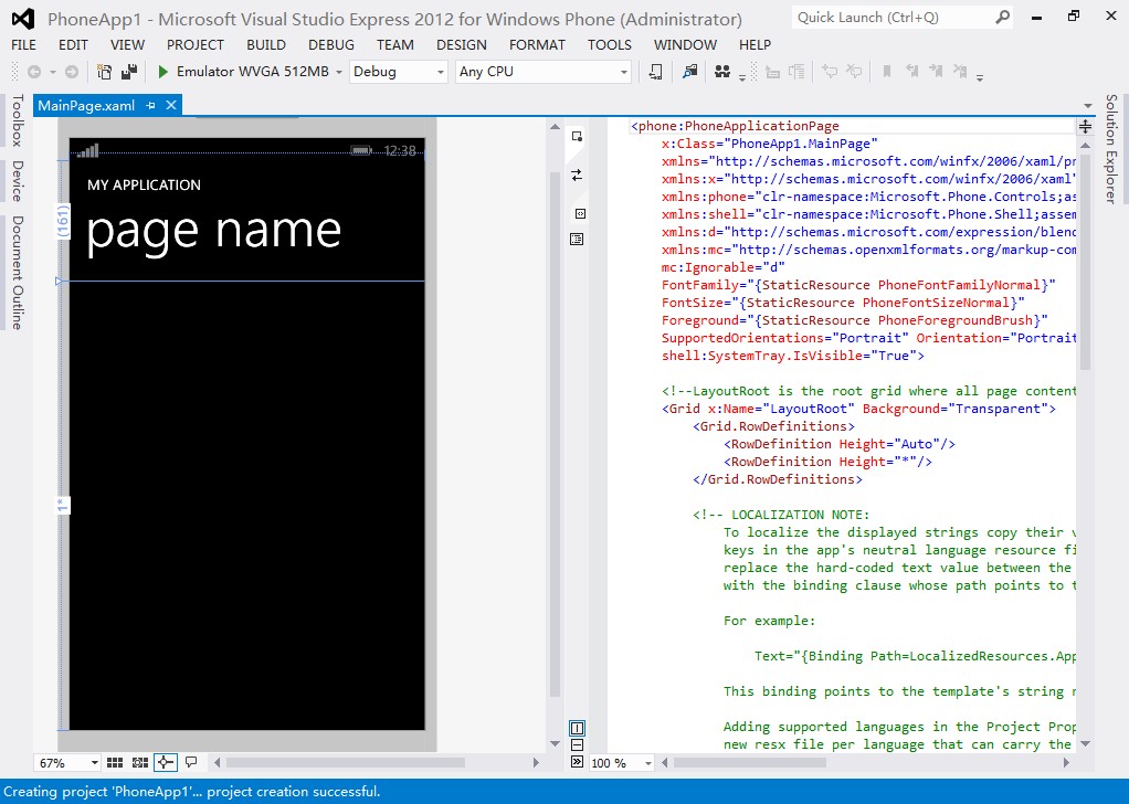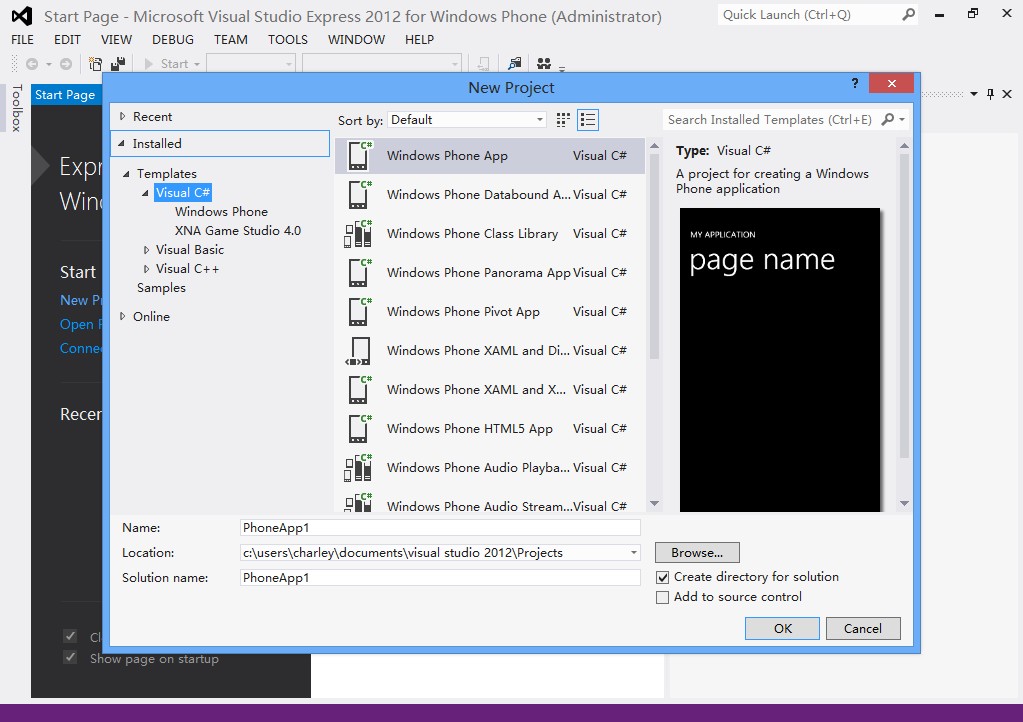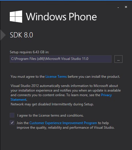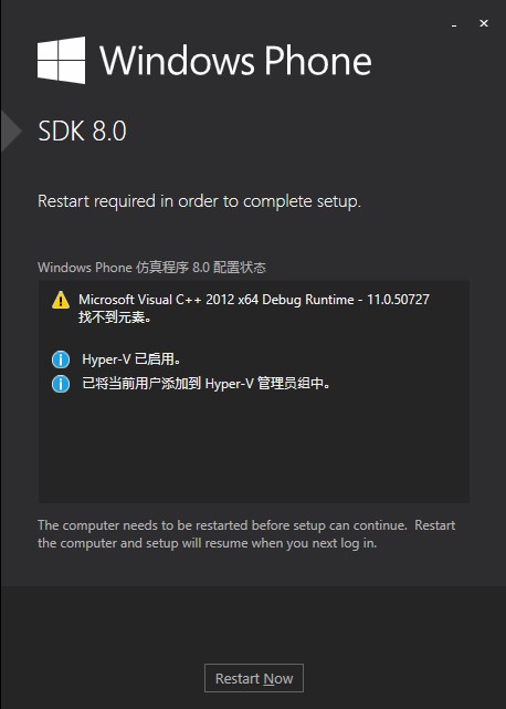 在官方下載頁面下載SDK后安裝,因為我下載的是iso版本,該版本貌似md5校驗碼有問題,所以在安裝完后會提示“Visual C++ 2012 x64 Debug Runtime 無法找到元素”。不過不影響我開發Windows Phone App,也就沒去細究。