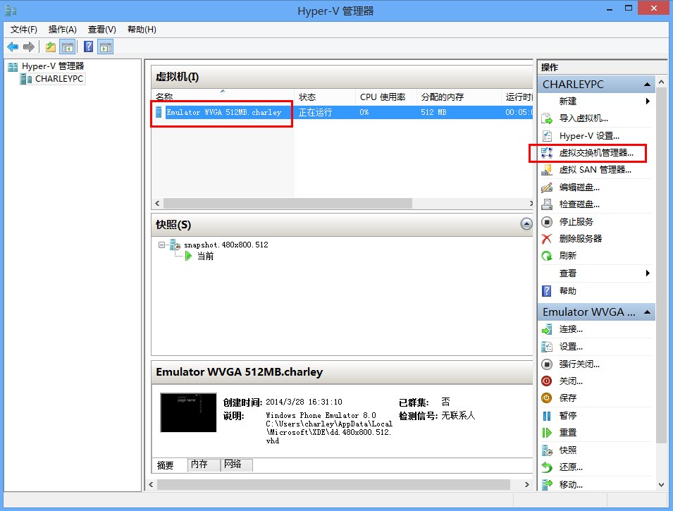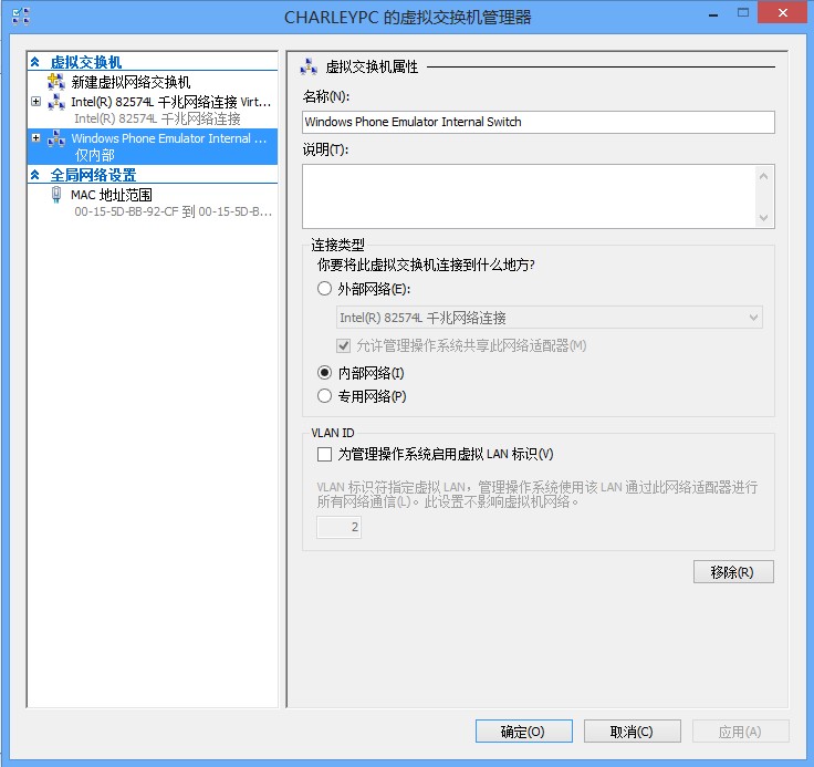 如果發些自己還是啟動不了模擬器,請檢查下自己的Hyper-V交換機是否已經建立。交換機配置中至少包含“Windows Phone Emulator Internal Switch”這個交換機。