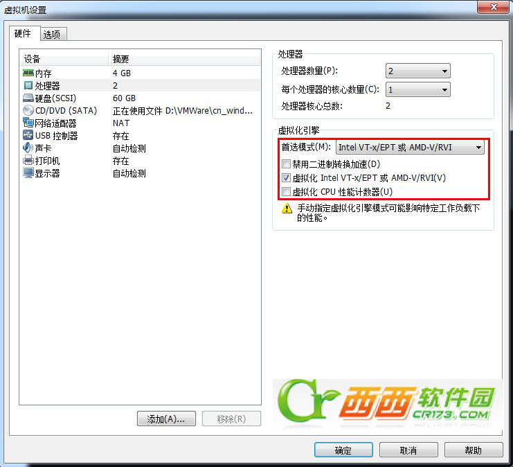 在啟動虛擬機前,設置CPU的虛擬化引擎為 “Intel VT-x/EPT 或 AMD-V/RVI”,同時讓CD/DVD指向Windows 8 專業版或更高版的iso文件。
