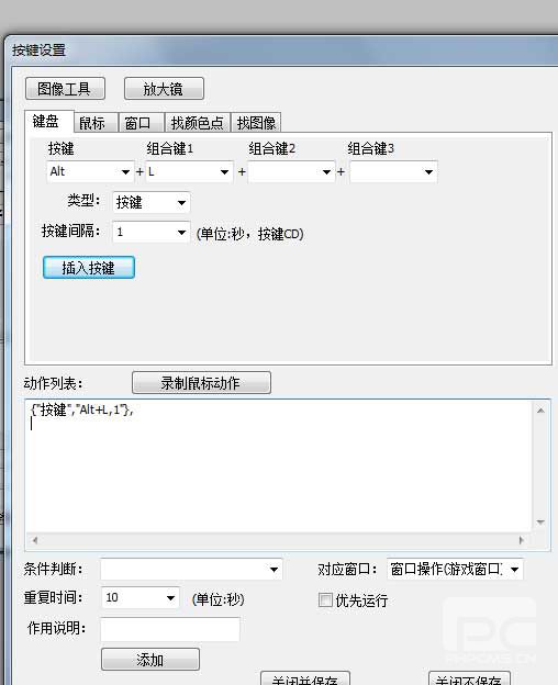 2.然后切換到“鍵盤”選項頁,在“按鍵”框中選Alt,在“組合鍵1”中選L,然后點”插入按鍵”,然后把“重復時間:”輸入:10,表示每10秒運行一次。在“對應窗口:”選“窗口操作(游戲窗口)”,最后點“添加”。這樣就實現第10按下Alt+L鍵,讓游戲人物自動走動。