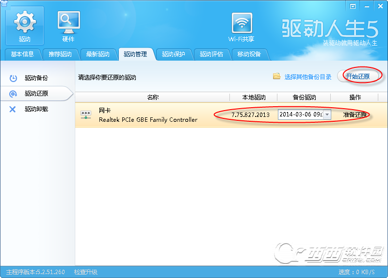 還原驅動程序與備份驅動一樣簡單,您需要點擊“其他備份目錄”按鈕,找到您備份驅動程序的路徑,如圖所示,我選擇的是我剛才備份驅動的那個文件夾D:drivesBackup,然后在左邊時間表中選擇需要還原的時刻,點擊“開始還原”即可還原驅動程序。