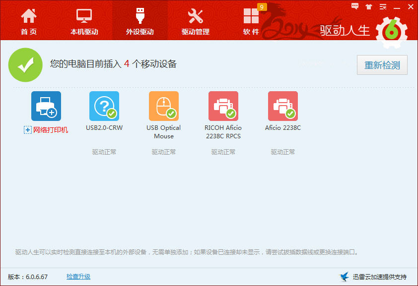 當前插入電腦的移動設(shè)備,在驅(qū)動人生6的外設(shè)驅(qū)動里面都會顯示出來,讓您一覽無余。只要您的電腦有接入移動設(shè)備,驅(qū)動人生都會自動檢測,并且給您的電腦自動匹配外設(shè)驅(qū)動。因此外設(shè)驅(qū)動能夠很好的管理電腦接入的移動設(shè)備驅(qū)動。