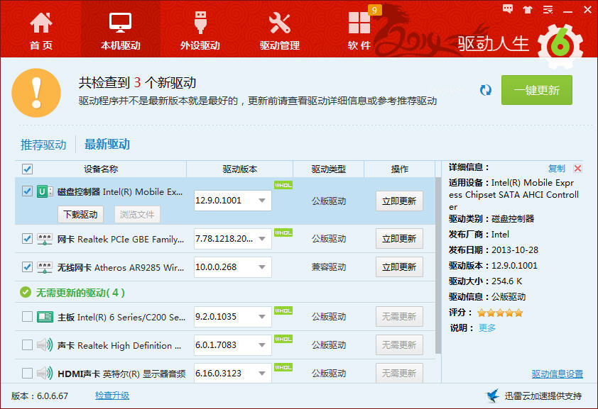 在驅(qū)動人生6的本機驅(qū)動分頁,分為推薦驅(qū)動和最新驅(qū)動。推薦驅(qū)動是驅(qū)動人生官方優(yōu)先推薦給用戶的電腦驅(qū)動,不一定是最新版本。也即推薦驅(qū)動是驅(qū)動人生官方推薦的認為最適合您電腦的驅(qū)動。這里的驅(qū)動適用于對電腦驅(qū)動程序知識不太懂的用戶,您可以完全信任驅(qū)動人生,讓它給您推薦適合您電腦的驅(qū)動。最新驅(qū)動是提供一些可選的驅(qū)動讓用戶自由選擇,有最新版本。也即,只要您電腦里的驅(qū)動程序有最新版本了,驅(qū)動人生就會在最新驅(qū)動里給您提示,更新與否,由您自己選擇。最新驅(qū)動板塊適合對電腦驅(qū)動程序要求比較高的用戶。但溫馨提示,驅(qū)動程序并不是最新版本的就是最好的,最適合電腦的驅(qū)動才是最好的,所以只要電腦能夠正常運行,不建議經(jīng)常更新電腦驅(qū)動。