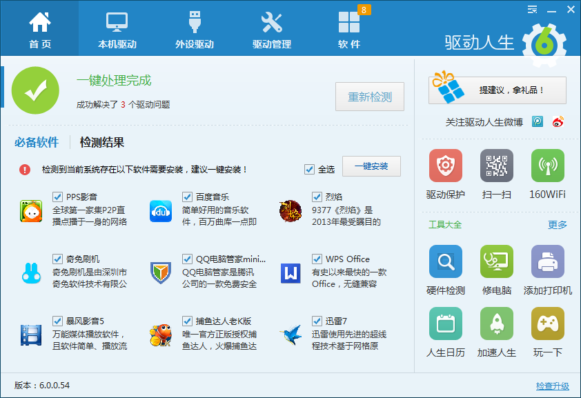 驅動人生6版本非常易用,采取“一鍵檢測”式邏輯結構進行設計,全自動檢測當前系統類型和判斷驅動缺失情況,全程用戶只需要點擊一個按鈕便可完成驅動安裝,連“小白”用戶也不會無所適從,按下“一鍵安裝”按鈕就能一鍵解決所有重裝系統后的驅動問題。
