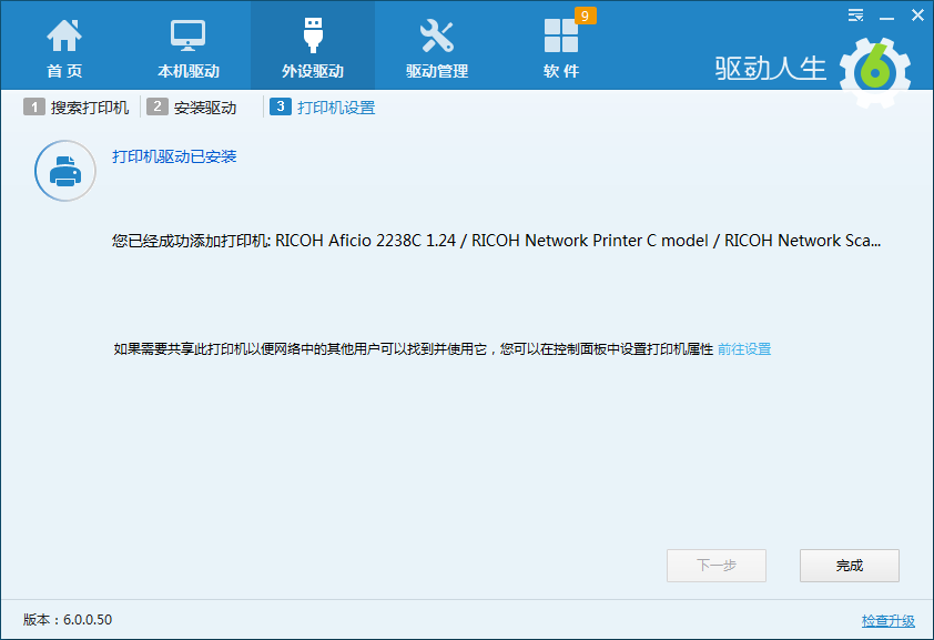 第三步,打印機設置。打印機驅動安裝完成之后,打印機就安裝成功了。如果需要共享此打印機以便網絡中的其他用戶可以找到并使用,還可以在這個頁面直接前往控制面板中設置打印機屬性。點擊完成,網絡打印機便安裝成功。
