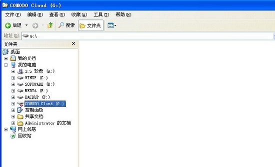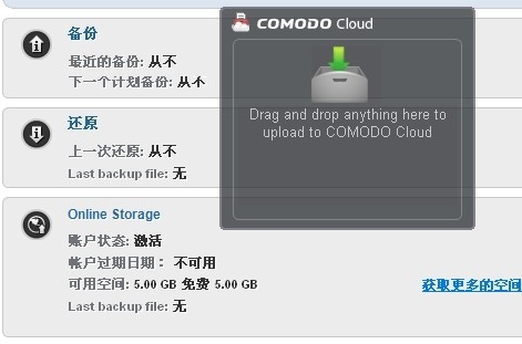連接到Comodo cloud會顯示有5GB免費空間,拖拽文件到圖示框中即可進行云備份,如圖(9)所示: