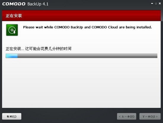 Comodo Backup正在進行安裝,安裝需要幾分鐘的時間,如圖(4)所示:
