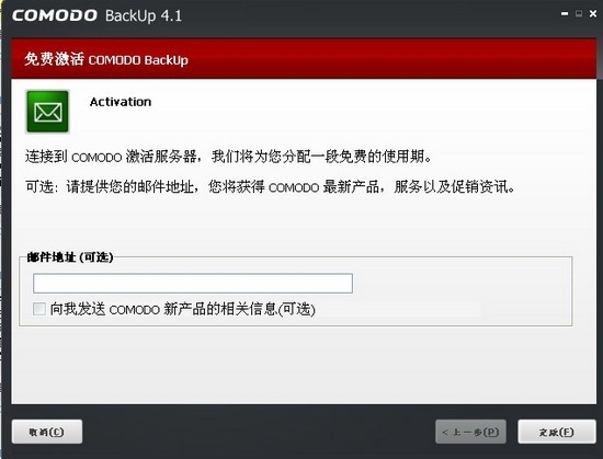 激活Comodo Backup,也可以輸入您的電子郵箱可以獲得Comodo 最新的產品、服務以及促銷資訊,如圖(5)所示: