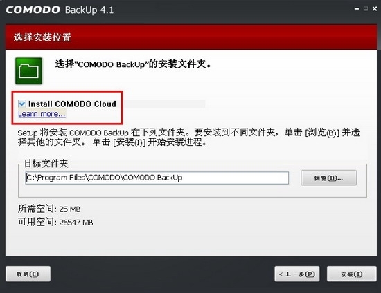 選擇安裝目錄,以及是否要安裝Comodo Cloud,建議選安裝,Comodo Cloud提供5G的免費空間,Comodo Backup可以直接將文件資料備份到Comodo Cloud的空間當中,如圖(3)所示: