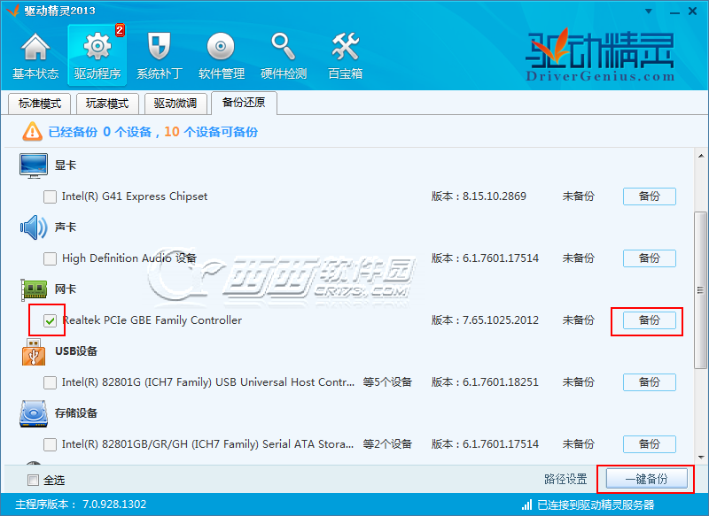 4、選擇想要備份的驅動程序,這里可以多選然后點擊一鍵備份,也可以選擇某一個點擊后面的備份,