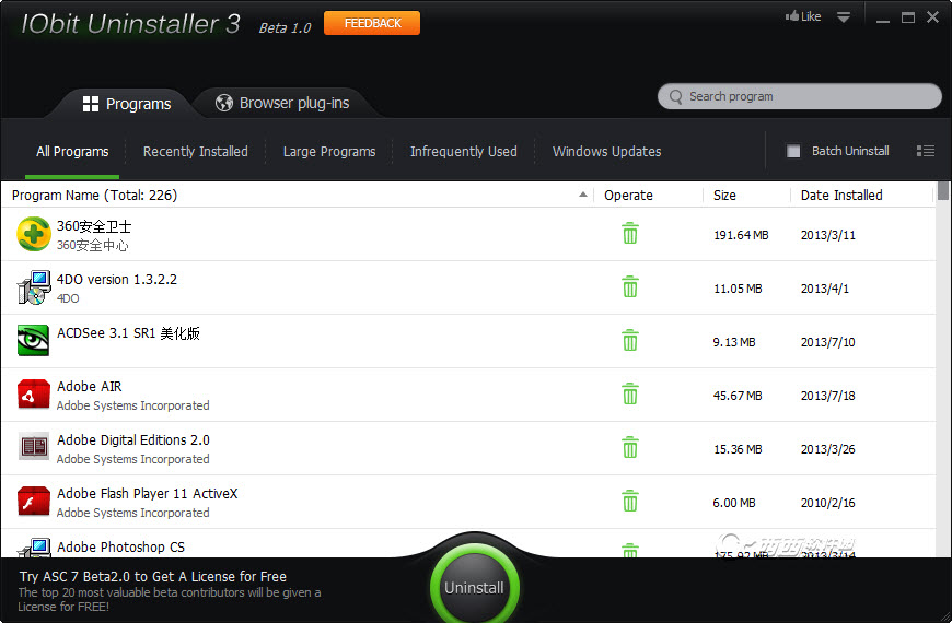 Iobit Uninstaller是一款綠色好用而且免費的軟件卸載,瀏覽器插件刪除的工具,支持軟件批量刪除和注冊表冗余文件清理,是您系統清理的好助手。Iobit Uninstaller目前沒有中文版,那么對于英語不好的朋友來說該如何使用呢,小編今天就分享自己的心得,希望能對大家起到拋磚引玉的作用。