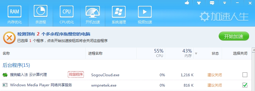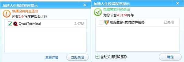 加速人生3.0.60.411版本 強化了此功能,程序殘留服務提醒優化功能:只要用戶退出一款軟件后,如有殘留的服務還在運行,將進行智能提醒,例如:快播沒有完全退出,還有1個程序在后臺運行。用戶可以點擊立即關閉,即可完全退出該軟件的所有服務,真真正正的為電腦節省內存空間。