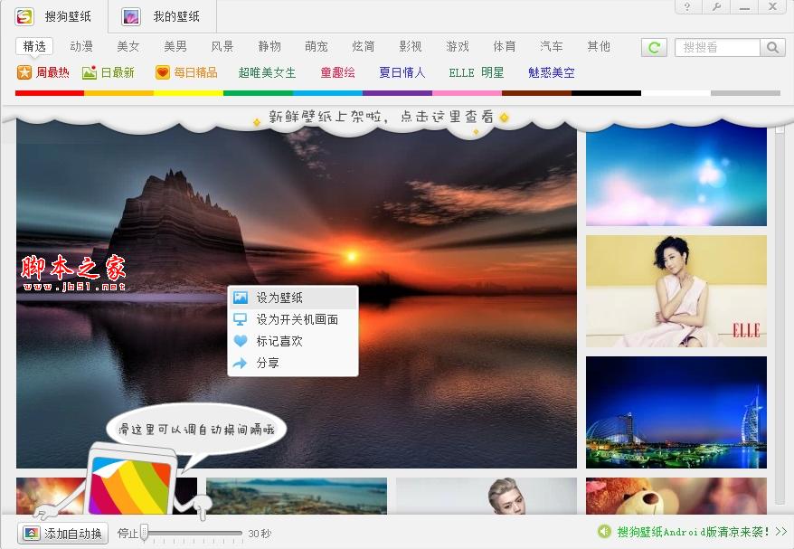 在搜狗壁紙左下角很明顯看到一個"添加自動換"按鈕,這個功能鍵可以幫你的桌面自動換壁紙哦,不過最大的間隔時間只有30秒
