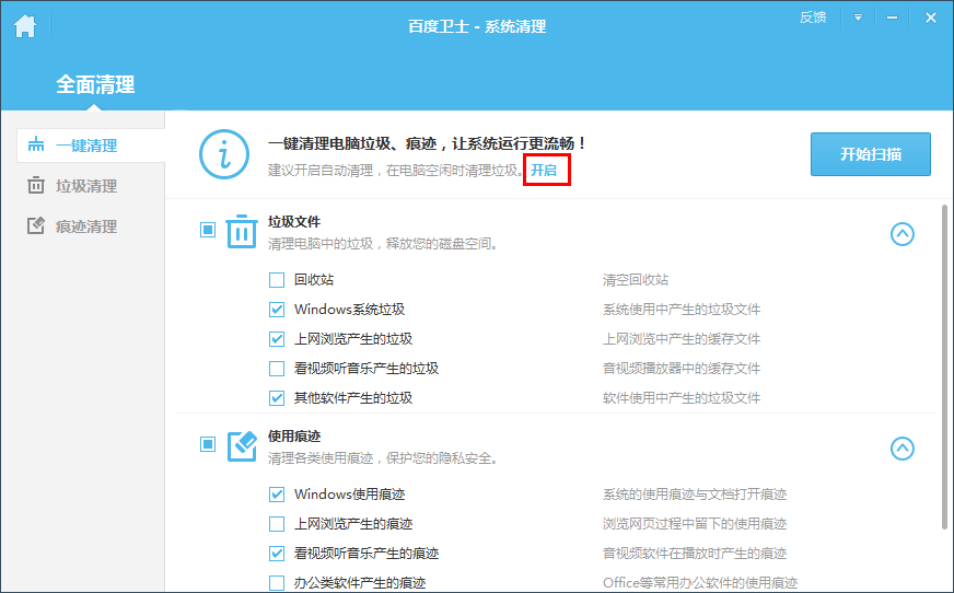 方法二,進入“一鍵清理”界面后系統會告訴您當前是否開啟了自動清理功能,點擊“開啟”即可設置成功。