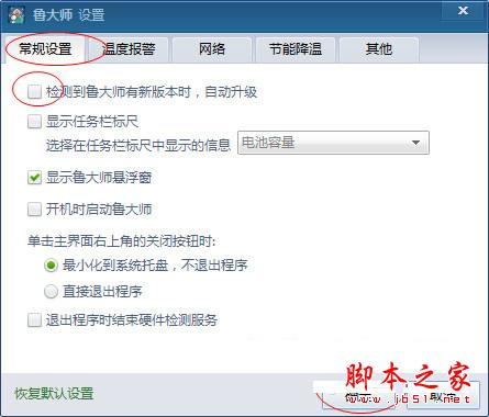 在常規設置選項卡中,取消勾選檢測到魯大師有新版本的時候,自動更新的選項,然后點擊右下角的設置按鈕,如圖所示: