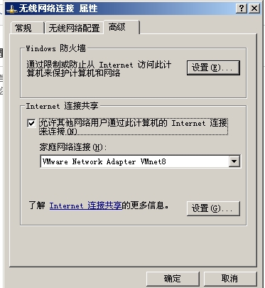 現在開始設置網絡,我使用的是無線網絡(如果是本地連接,設置方式相同),右鍵選擇無線網絡連接,在屬性窗口中選擇高級,選中允許其他網絡用戶通過此計算機的Internet連接來連接,并在家庭網絡連接處,選擇 VMware Network Adapter VMnet8,如圖,確定