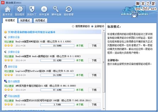 打開主界面后(下圖)依次選擇“驅動程序”,“標準模式”選擇“推薦更新驅動”。如電腦基礎較低,可選擇“向導模式”按提示操作即可。
