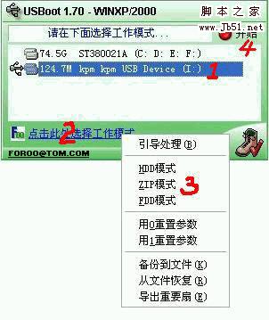 (2).運行"2_安裝內核.exe" (其實就是USBOOT 1.7),如圖,選中U盤①,選擇工作模式②為HDD模式③