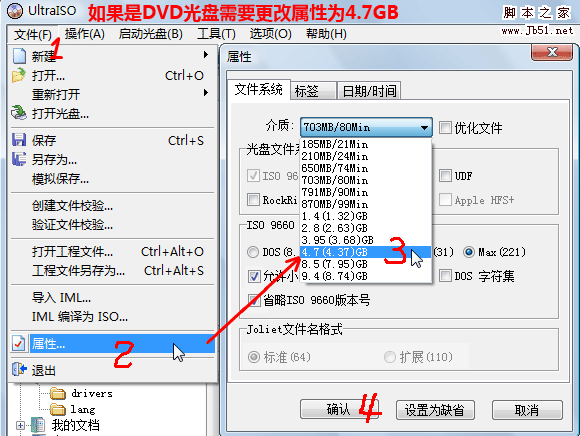 (如果刻錄DVD光盤,請點擊"文件->屬性->介質->選擇 4.7G",如圖)