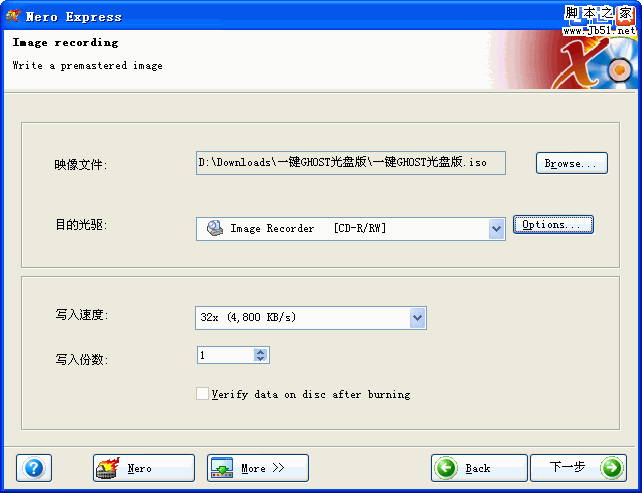 (如,全速是52x可選擇32x,如果硬件配置較低,應選16x或8x) -> 點"下一步",