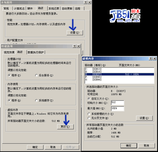 右鍵“我的電腦”選擇屬性-高級-性能設置-高級-更改;先選擇C盤,勾中“無分頁文件”選項,然后選擇其它分區,勾選“自定義大小”。如果你是1G內存的話,設為512~1024就足夠了;然后點擊設置。如下圖