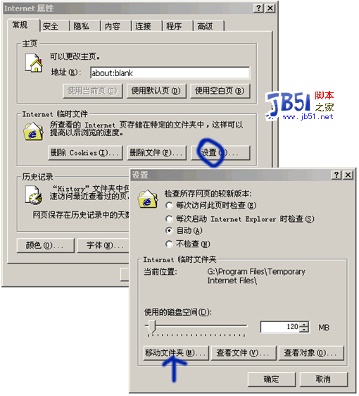 點擊開始-設置-控制面板-INTERNET屬性-常規-設置-移動文件夾。如圖