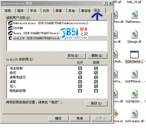 接著裝QQ吧。大部分人不喜歡QQ的迷你新聞窗口。這里提供一個小謝原創的方法解決這個問題,但有個前提,QQ所在分區的文件系統是NTSF格式的。進入QQ安裝目錄,選擇QQexternal.exe文件,右鍵選擇屬性-安全,選中自己的用戶名,設置如圖