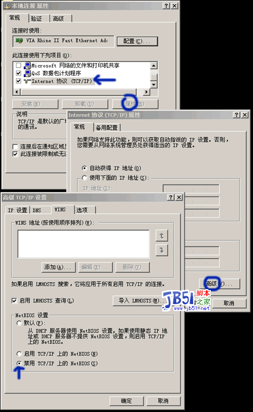 接著,點擊開始-設置-網絡連接;右鍵本地連接,選擇屬性;選中INTERNET協議并點擊屬性;出現新的對話框,選擇高級-WINS,勾中禁用TCP/IP上的NETBIOS。這也是個大漏洞。
