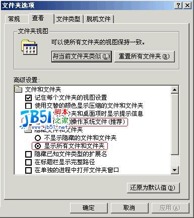 2.打開“我的電腦”,在菜單列選擇“工具”-->“文件夾選項”,之后選擇“查看”標簽。在下框中,選擇“顯示所有文件和文件夾”及將“隱藏受保護的操作系統文件(推薦)”前的勾去掉,在系統彈出警告框時選擇“是”,最后按確定。