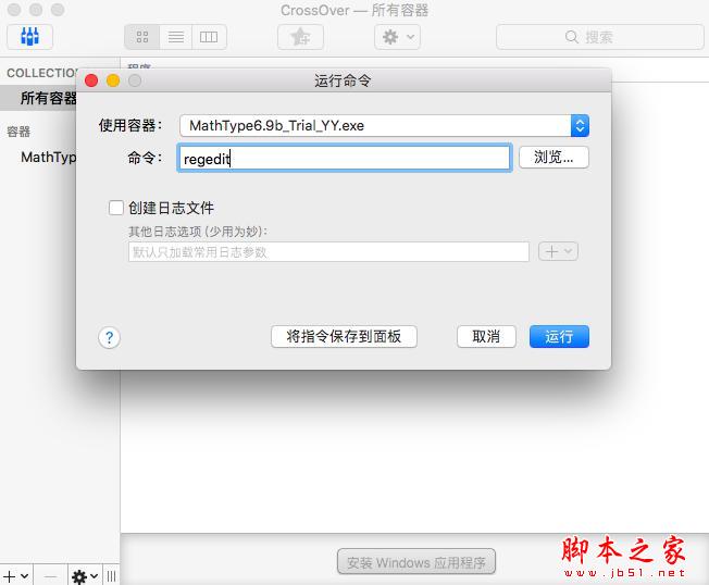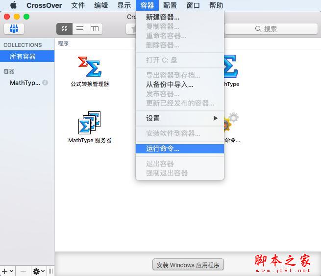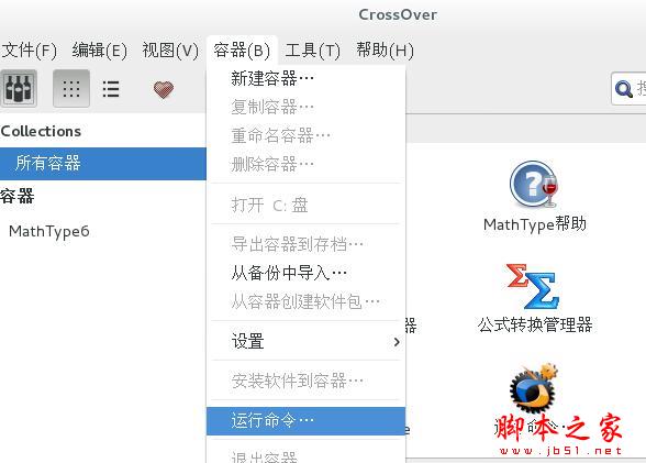 1、打開CrossOver,從屏幕頂部的菜單欄中選擇【容器】,然后再選擇【運行命令】;