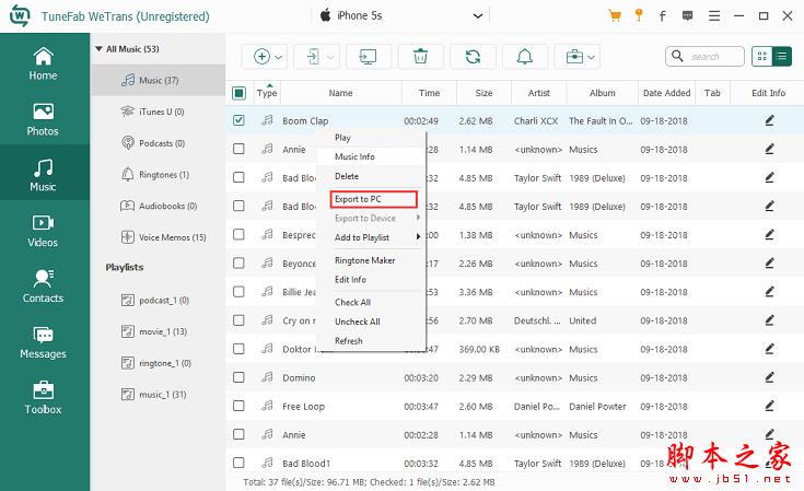 1.右鍵單擊音樂,然后單擊“導(dǎo)出到PC”并選擇文件夾。只需等待幾秒鐘,即可從預(yù)先設(shè)定的文件夾中獲取音樂。