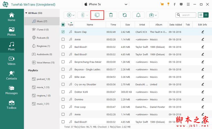 單擊左側(cè)的“音樂”,您可以看到iOS設(shè)備的整個音樂庫。單擊“音樂”或播放列表名稱以選擇要傳輸?shù)接嬎銠C/ iOS設(shè)備的音樂。