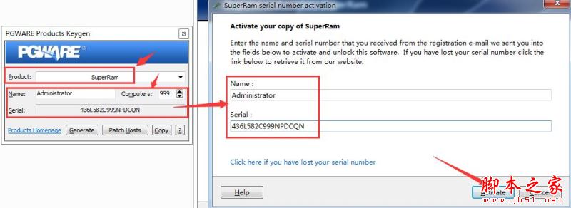 12、運行軟件包里的Keygen.exe注冊機,在Product里選擇SuperRam,將注冊機生成的用戶名及注冊碼,填入軟件注冊界面相應的信息里,點擊Activate(注操作此步驟時一定要斷網,否則注冊不成功的)