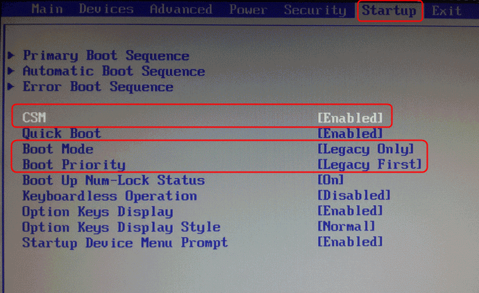 進入“Startup”,將“CSM”(兼容支持模塊)設置成“Enabled”,將“Boot Mode”設置成“Legacy Only”,將“Boot Priority”設置成“Legacy First”。
