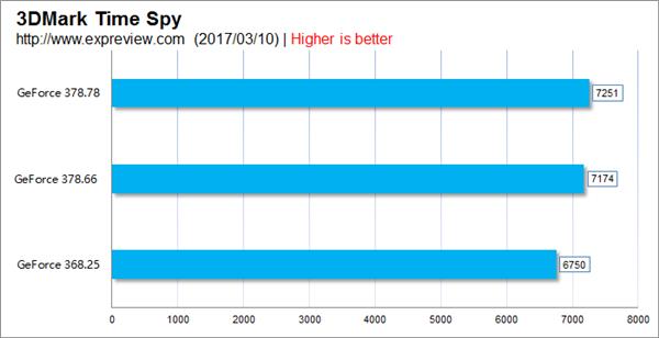 在3DMark DirectX 12基準測試Time Spy中,378.78驅動成績從7174提升至7251,只有可憐的1.07%提升,但是對比2016年5月26日發布的GeForce 368.25驅動來說,提升了7.42%,看來NVIDIA還是有用心做好每一版驅動優化的。