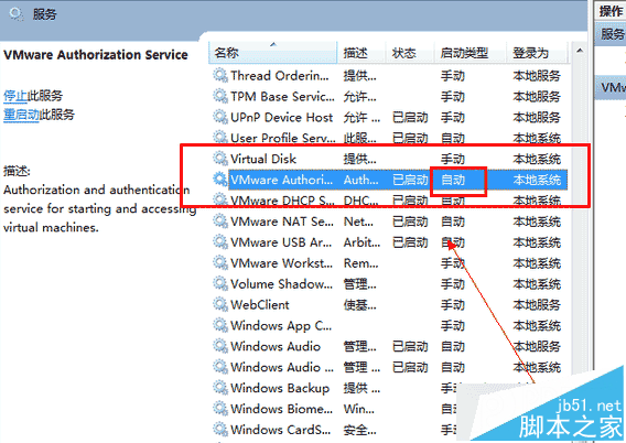 6、在服務列表中找到VMWare Authorization Service,并將其設置為自動啟動并且開啟服務即可。