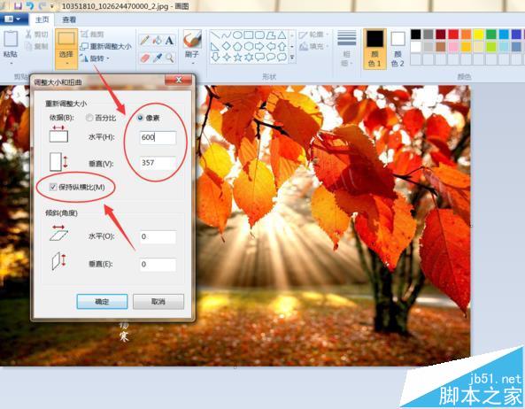 7、修改像素。為了保證圖片不失真,需先勾選【保持縱橫比】,這樣只要在【水平】或【垂直】框任意一個(gè)中輸入新數(shù)值,另一個(gè)數(shù)值也會(huì)跟著變化,圖片原比例不變。小編在這里把【水平】數(shù)值改為600,【垂直】自動(dòng)改為357,單擊【確定】
