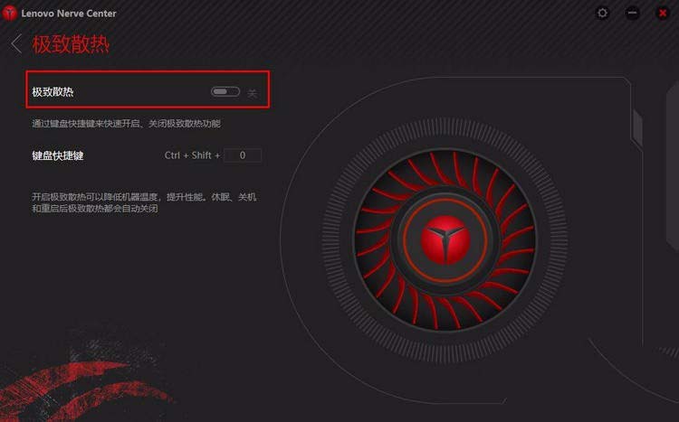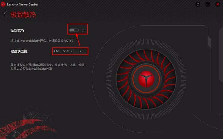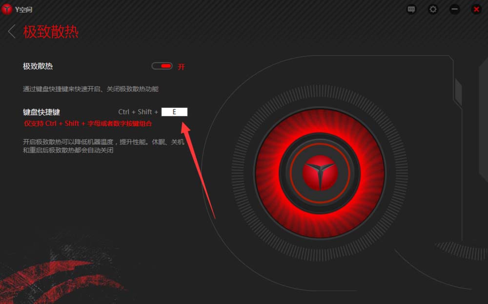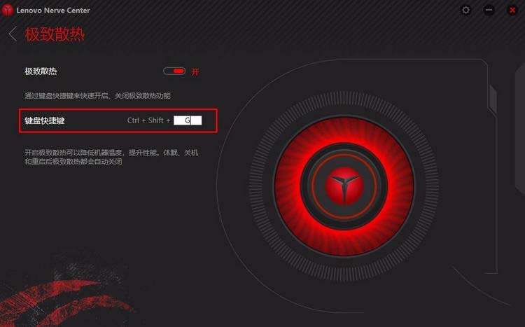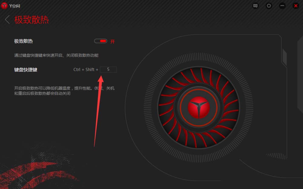 5、開啟之后,開關就會變成紅色的,此時筆記本后邊的風扇就啟用了,右側的風扇也變為動態的了,這里也可以設置控制開關的快捷鍵,直接輸入鍵盤上的字母即可。