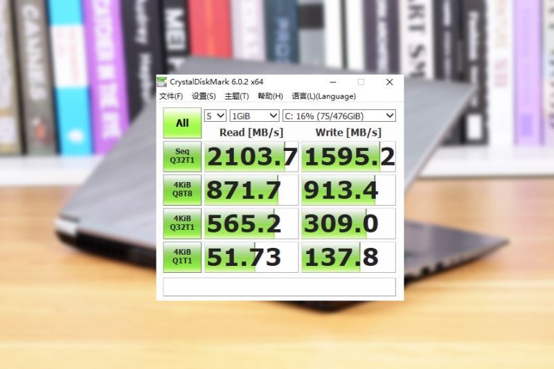 他的硬盤運用的是500G建興CL1固態硬盤,測驗最高速率能到達2100M/s,寫入速率1600M/s左右,而4K隨機讀寫也能到51M/s,137M/s。