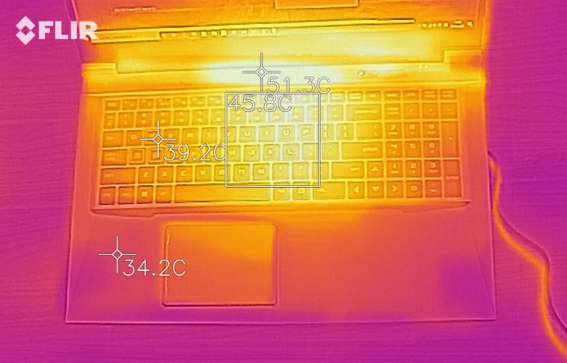 而此刻C面WASD區域的溫度來到39.2度,手托處溫度堅持涼快狀況,僅有34.2度,熱源會集鍵盤中部偏上的方位,其間頂部方位溫度到達51.3度。