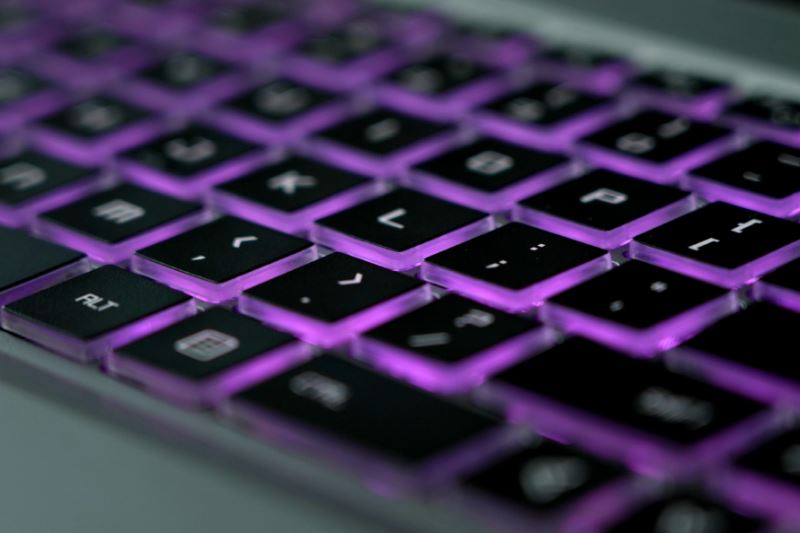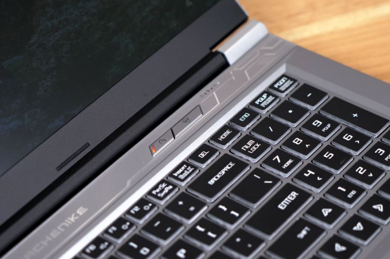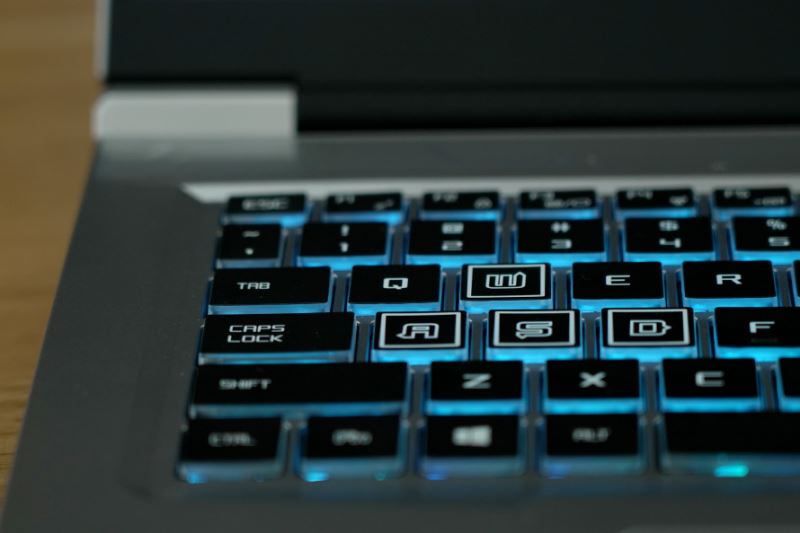 C面鍵盤配備有全尺度多彩背光鍵盤,數字小鍵盤,全尺度方向鍵一應俱全,因為按鍵四周沒有漆面,在點亮燈火是,按鍵周圍面也會發散出燈火。這款筆記本的按鍵手感略軟但鍵程較長,在文字輸入時具有相對不錯的按壓體會。