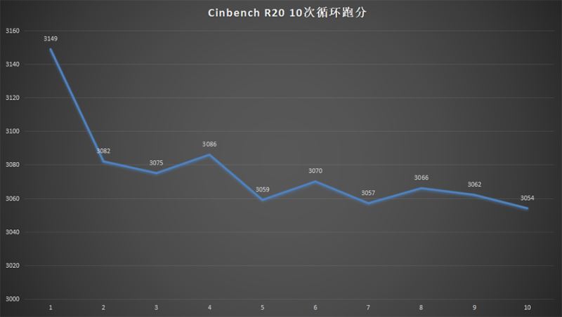 而多核功能上夠到達3149的分數,即使經過接連10次的Cinbench R20循環測驗,分數也只要小幅下降,根本可以堅持在3050分的水平。而對應游戲形式和作業形式,Cinbench R20多核別離獲得3116和2481的成果。