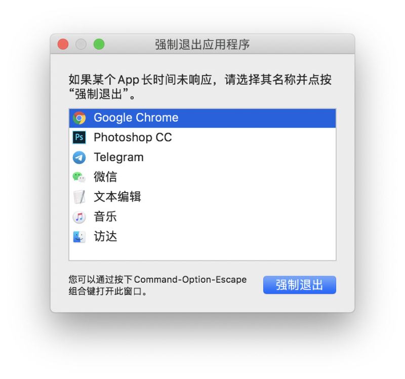 如果軟件長時間未響應,可以按下鍵盤快捷鍵「command」+「option」+「ESC」,進行強制退出。