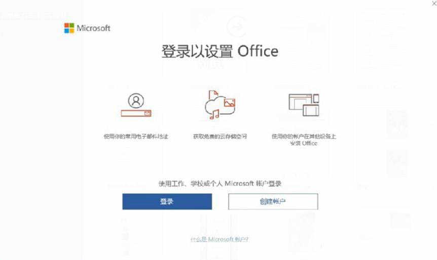 2、以 Word 應用為例,打開 Word 應用后,會彈出“登錄以設置Office”的界面,如果您有微軟帳戶,直接點擊“登錄”;如果沒有微軟帳戶,點擊“創建帳戶”并按照提示注冊一個。