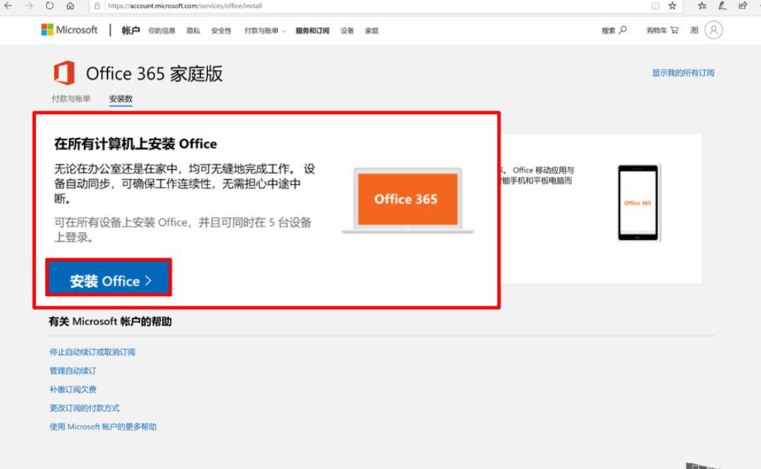 (1) 打開網址https://stores.office.com/myaccount ,登錄您前面激活 Office 時用的微軟帳戶,進入服務和訂閱界面,該界面顯示該微軟帳戶下綁定的 Office 產品信息。選擇需要安裝的 Office,點擊“安裝”。