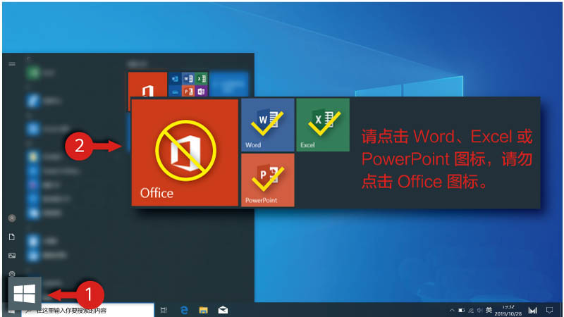 1、點擊 Windows 圖標,選擇一個 Office 應用并打開(注意:請點擊 Word、Excel、PowerPoint 三個圖標中的任意一個,千萬不要點擊“我的 Office”,很多用戶就是點了“我的 Office”而沒法順利激活內置 Office 的啦)。