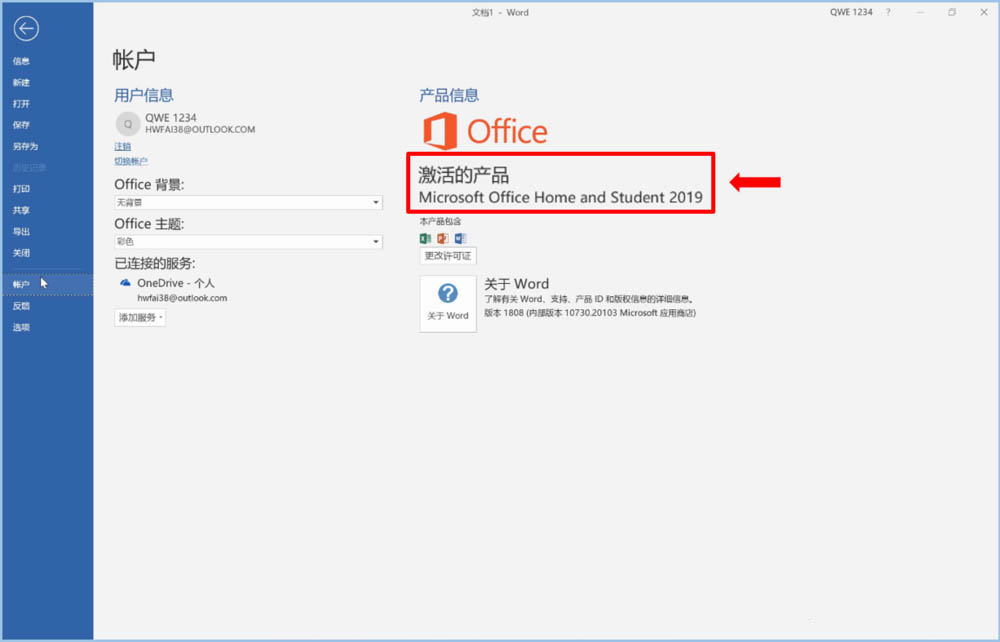6、至此您已經完成 Office 的激活了。您可以點擊“文件 > 帳戶”,查看 Office 產品激活信息,在“激活的產品”下面哦~